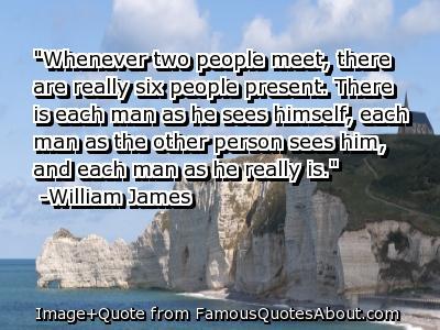 ![]() İki kişi karşılaştıklarında aslında altı kişi bir araya gelmiş olur. Karşılaşanların kendilerini sandıkları kişiler, karşılarındakini sandıkları kişiler ve gerçekte oldukları kişiler. William James |